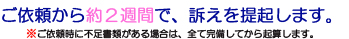 通常、ご依頼を頂いてから、書類、事件内容に不備や問題点がなければ、2週間程度で裁判所に訴えを提起するように進めております。